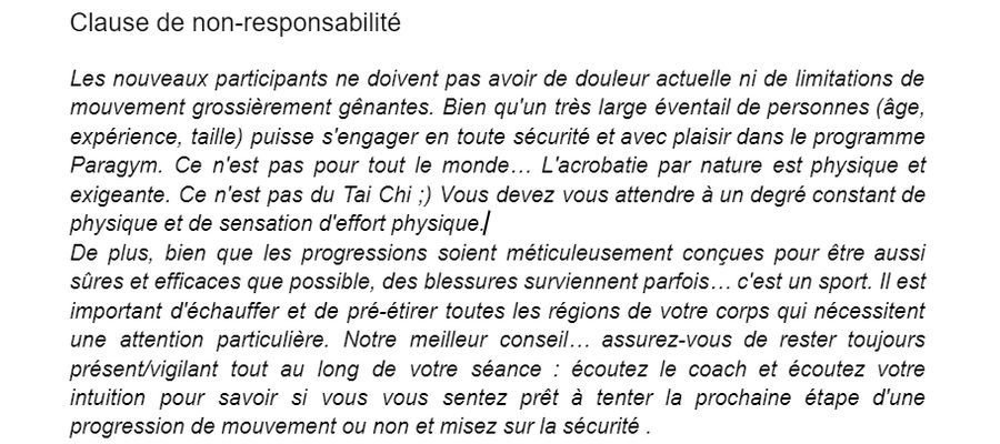 OBSTACLES - Ce cours enseigne les bases des sauts PARKOUR, les mouvements de terrain, les déplacements, les défis de sauts et souvent une première initiation aux flips impliquant des obstacles.ÉQUILIBRE - Ce cours enseigne principalement les appuis renversés et l'équilibre vertical et prend pour acquis que vous avez la force de faire reculer votre corps jusqu'à une inversion presque complète contre le mur. (sinon, prenez Equibasics)