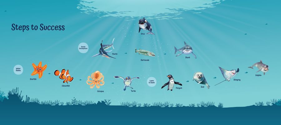 The Seal Level focuses on developing strong foundational water safety habits, independent swimming skills, and confident breathing techniques. Swimmers in this level are becoming more self-reliant in the water, learning to move, float, and breathe with increasing control and comfort.